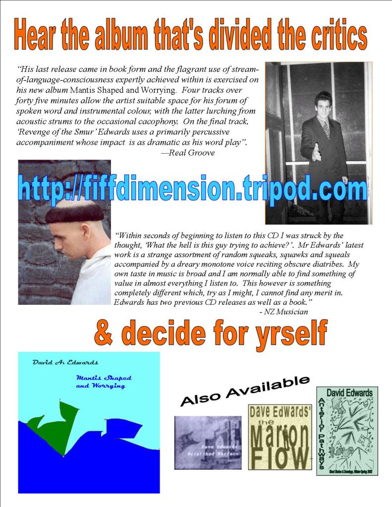 “Four tracks over 45 minutes allow the artist suitable space for his forum of spoken word and instrumental colour, with the latter lurching from acoustic strums to occasional cacophony. On the final track, ‘Revenge of the Smur‘ Edwards uses a primarily percussive accompaniment [by Simon O’Rorke] whose impact is as dramatic as his wordplay” – Real Groove