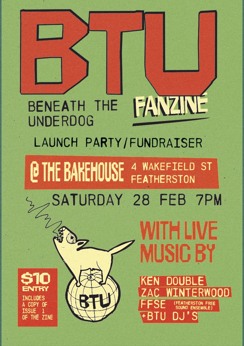 Join us to launch Beneath the Underdog (BTU), an old-school DIY, fanzine focusing on local music, arts and ideas from the fringes. With BTU we hope to shine a wee spotlight on people doing interesting and creative things and comment on things we think deserve attention.